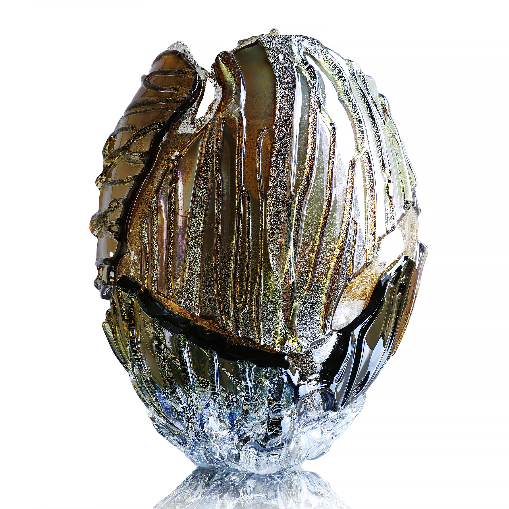 彼の作品は「生命の輝きと再生」をテーマに、日本美学と革新的な技法を融合させたものです。代表作《硝子呼継 Glass Yobitsugi》では、意図的な破壊と再構築を通して欠陥を「再生の美」へと昇華させ、金継ぎの哲学に通じる「不完全の美」を映し出しています。その革新的な視点は新しい芸術観を切り拓き、国際的な高い評価を獲得してきました。